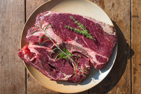 Raw beef steak with rosemary in a plate on a wooden table