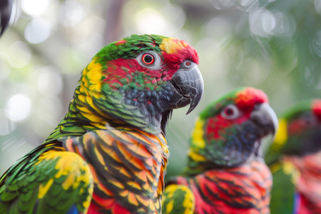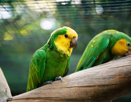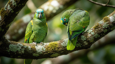 Two green parrots are perched on a tree branch, showcasing vibrant feathers and detailed textures. The image is taken during daylight, with natural lighting creating a soft effect. Ideal for ecological or environmental themes, or for commercial use such as advertising or editorial content.