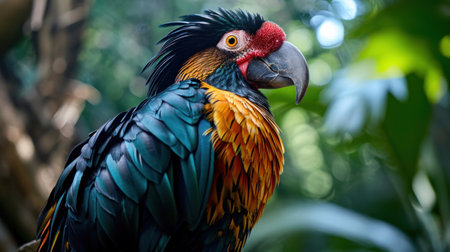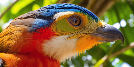Close-up of a colorful parrot with vibrant feathers and a striking beak.