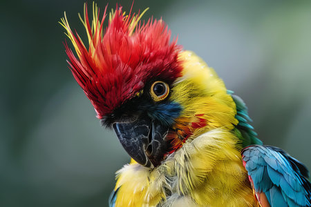 Closeup of a colorful macaw parrot with a striking red crest, showcasing detailed plumage