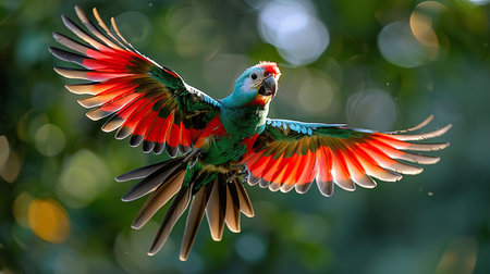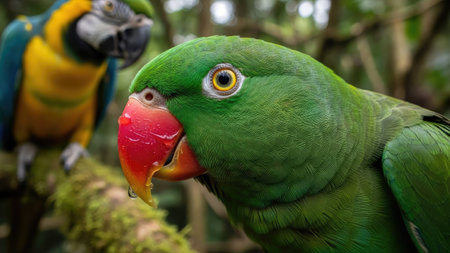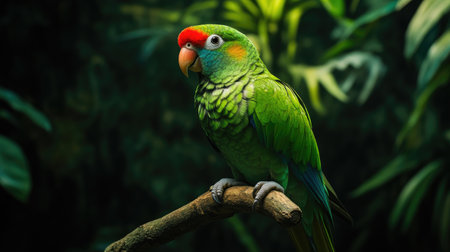Vibrant parrot with green feathers and red accents perched in a lush jungle setting, full of tropical charm. Generative AI
