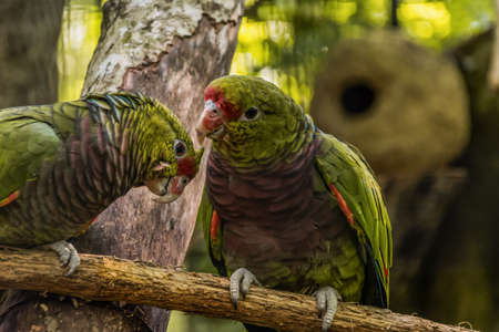 Mexican Red-headed tropical parrot on a brunch, zoo. birds. Colorful exotic birds.