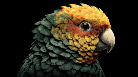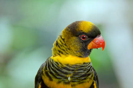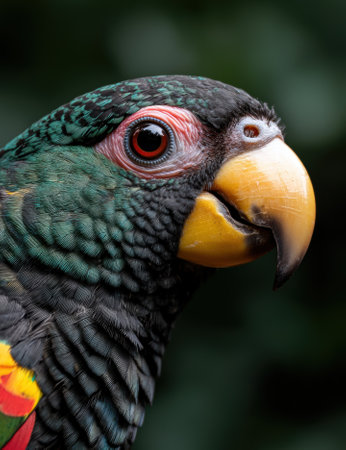 Parrot with green, yellow, orange and black feathers, portrait, profile close up view