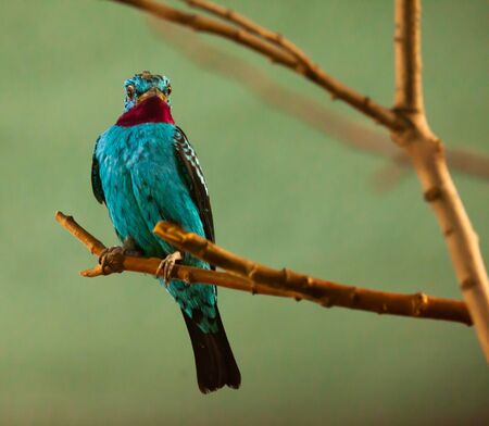 Spangled Cotinga with red and blue feathers at branch