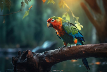 parrot on a wooden branch in the middle of the forest. generative ai