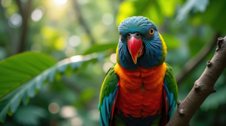 A vibrant parrot with blue, green, red, and yellow feathers perches on a branch. It's positioned in a tropical forest setting with lush greenery and dappled sunlight in the background. The parrot has a red beak and dark eyes, and its feathers have a glossy sheen.
