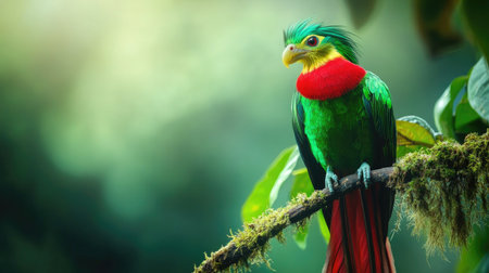 Portrait of the Quetzal Bird in the wild . A magnificent sacred mystical green-red mystical bird. Magnificent quetzal in the jungle.