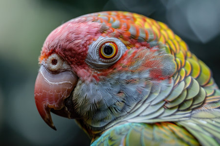 A detailed close-up presents a vibrant macaw parrot, showcasing rich greens, blues, and oranges in its plumage. The image emphasizes the bird's eye and beak, with a soft background suggesting an outdoor environment. This image is suitable for various commercial uses, including editorial content and design projects.