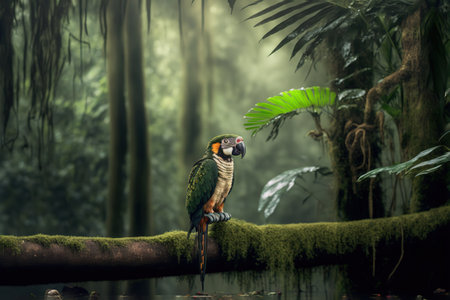 a parrot mimicking sounds in the dense jungle, created with generative ai