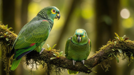 Two vibrant green parrots are perched on a moss-covered branch, displaying intricate feather details. The image features a shallow depth of field, with soft, blurred green hues creating a natural, outdoor ambiance. This photographic composition could be suitable for nature documentaries, educational materials, or decorative purposes.