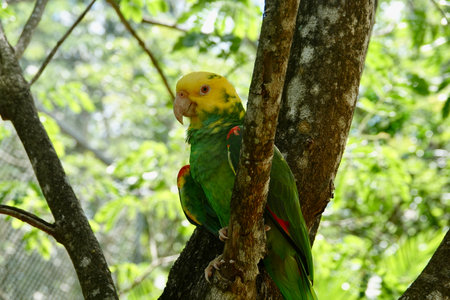 Two green parrots with yellow heads and red wing markings are seen perched on a tree branch. The image highlights the birds against a backdrop of green foliage, displaying natural textures and soft lighting. This photograph could be utilized for nature-themed projects, educational content, or illustrative purposes.