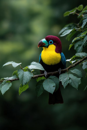 Vibrant toucan perched on a branch in lush green foliage