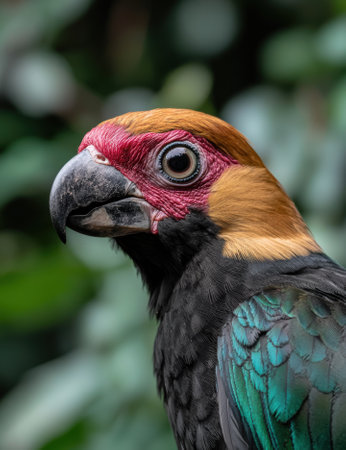 A close up of a colorful bird with blue eyes and red beak, AI