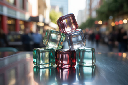 A close-up shot showcases an assortment of transparent ice cubes, some containing a vibrant red liquid, artfully arranged. The shallow depth of field blurs a lively city scene in the background, creating a captivating visual.