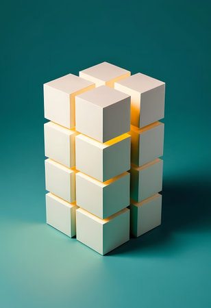 Stack of white cubes with yellow light on green background. 3d rendering