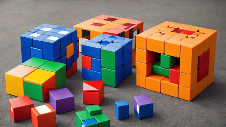 The image showcases colorful cubes, including teal, orange, and red, stacked on a textured black surface. The background is slightly blurred, creating a vivid, engaging atmosphere.