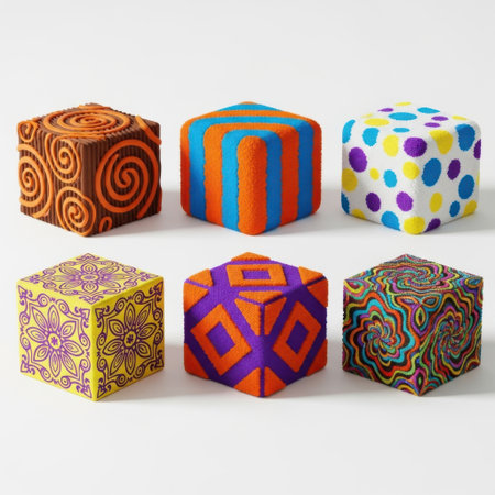 Vibrant, reflective cubes featuring various metallic textures laid organized on a pale surface, illuminated by gentle light that highlights their shimmering, intimate
