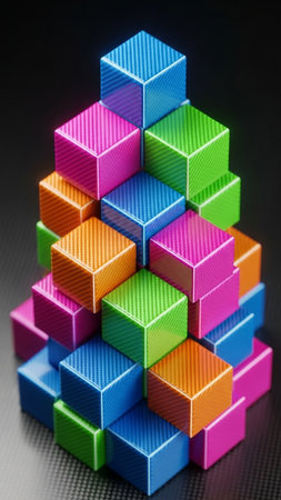 Stock showing a pyramid-shaped stack of colorful, textured cubes in vibrant shades of blue, pink, green, and orange, arranged in a visually appealing and balanced...