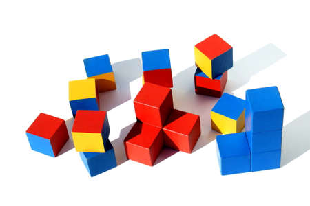 Children's wooden cubes on a white background. Colored cubes for kids. The children's construction set is scattered on white.