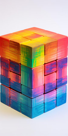 A vibrant, multi-colored cube made of transparent blocks rests against a plain white backdrop. The composition features a geometric style. The image showcases variations in color and texture. Suitable for diverse commercial and editorial purposes, the graphic has copy space.
