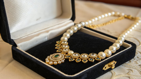 A delicate gold necklace with intricate patterns and gemstones, resting on a satin fabric, capturing the elegance and timeless appeal of luxury jewelry
