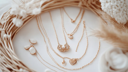 A beautifully arranged set of elegant gold and pearl necklaces surrounded by soft decor elements, ideal for showcasing modern fashion and timeless beauty.