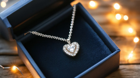 This stunning heart-shaped necklace is elegantly displayed in a plush jewelry box with gentle background lights, making it an ideal gift for romantic moments.