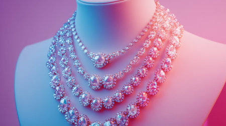 This stunning image features a collection of elegant necklaces arranged beautifully against a soft pink and blue background, highlighting their intricate designs and sparkling gemstones.