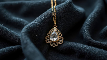 Elegant gold necklace with diamond pendant on black fabric background. That the image is generated using AI.