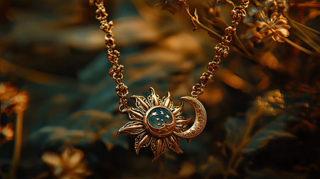 A stunning gold necklace blends a sun and crescent moon pendant, showcasing intricate craftsmanship against a soft, dreamy nature backdrop.