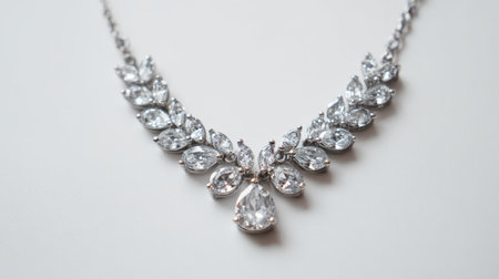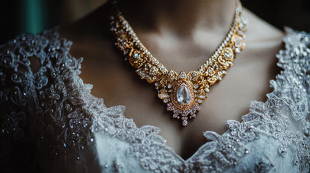 A stunning close-up view of an elegant necklace showcasing intricate details and sparkling gemstones. Ideal for bridal fashion and jewelry collections.