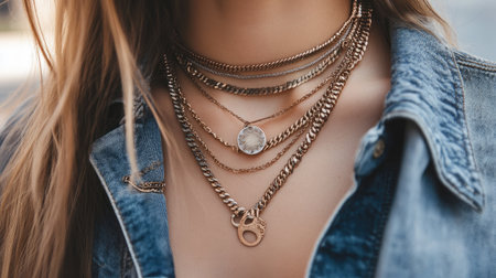 A collection of layered necklaces with different styles, including chokers and long chains, for a trendy fashion look