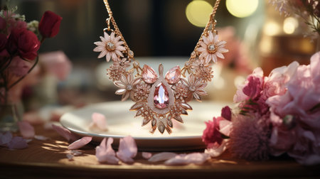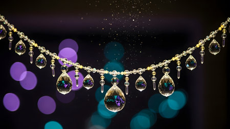 Jewelry garland with precious stones on bokeh background