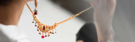 cropped view of young bride holding necklace on white, banner