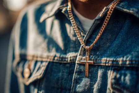 A shimmering gold pendant with a cross design dangles over textured denim fabric, illuminated by soft sunlight, blending spiritual meaning with casual elegance.