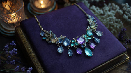 A beautifully designed necklace featuring colorful gemstones is prominently displayed on rich purple fabric, creating an elegant and artistic still-life composition.