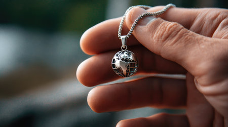 A stunning silver globe pendant held delicately in hand, symbolizing global connectivity. This striking piece captures the essence of travel and exploration.