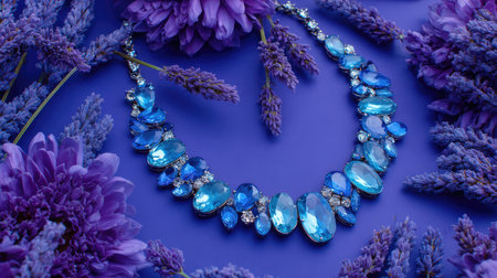 An exquisite blue gemstone necklace elegantly placed among lush purple flowers, capturing the essence of beauty and style, perfect for various creative and fashion-themed projects.
