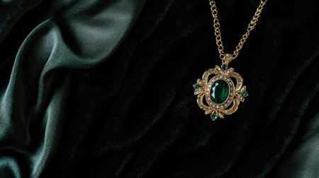 A stunning green gem pendant elegantly rests on a dark satin fabric, showcasing luxury and sophistication, perfect for fashion enthusiasts.