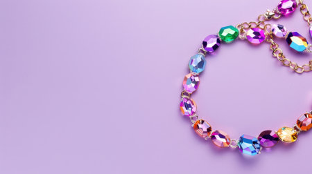 This image showcases a vibrant bead necklace displaying an array of colorful, sparkling beads against a soft purple backdrop. Perfect for fashion and jewelry related themes.