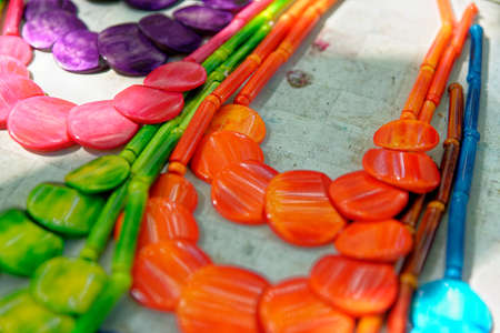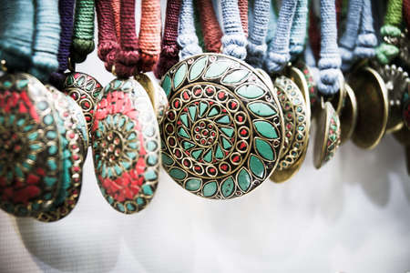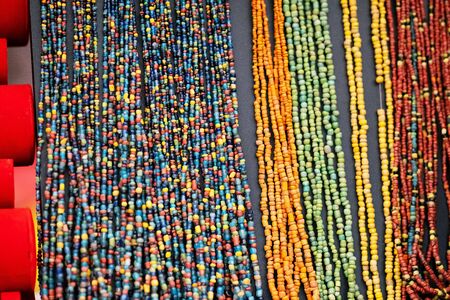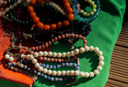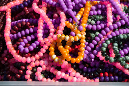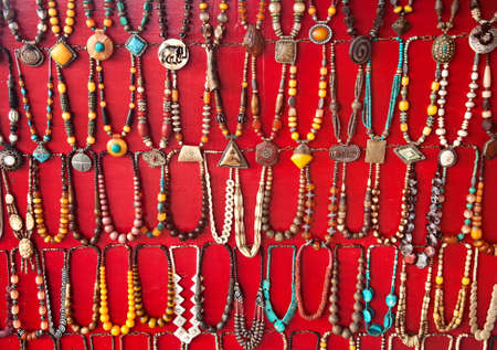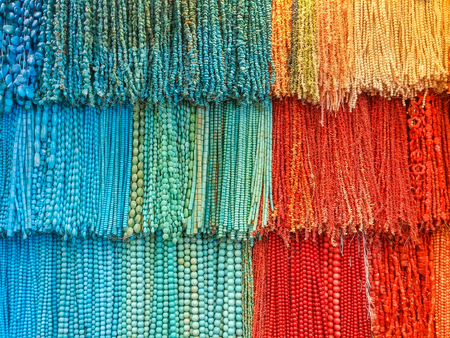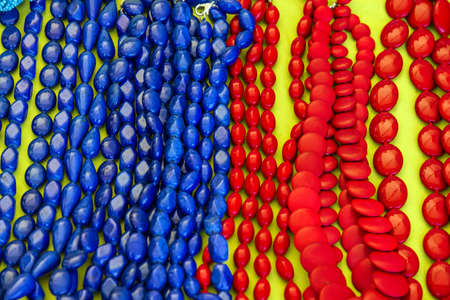 Colored jewelry in a Egyptian shop. Red, blue and yellow beads