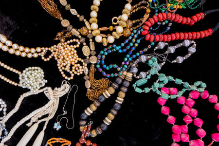 Wallpaper background of colorful vintage jewelery scattered on a black velvet at a shop.