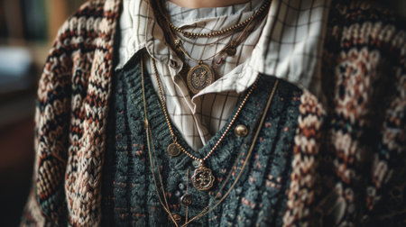 Vintage-Inspired Fashion Detail of Woman Wearing Layered Necklaces and Patterned Jacket