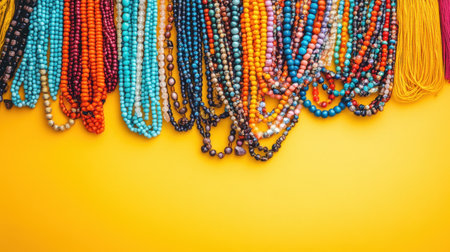 A stunning array of colorful beaded necklaces rests on a bright yellow background, showcasing a variety of textures and intricate designs perfect for any outfit.