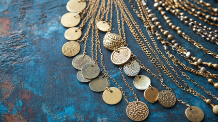 A stunning display of golden jewelry showcasing intricate craftsmanship on an artistic blue background, highlighting the elegance and beauty of each piece.