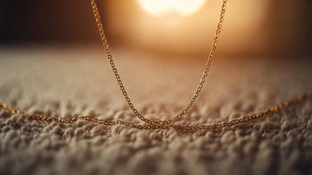 A close-up shot of delicate gold chains lying gracefully on soft fabric, illuminated by warm sunset light, creating an inviting and tranquil ambiance.