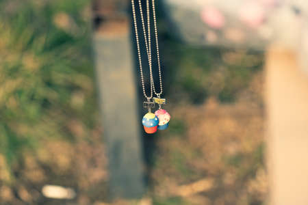 Best friends necklace shoot outside in a summer day closeup. Selective Focus