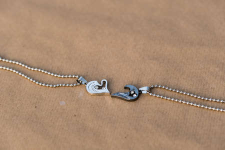 Couple set pendant necklace half of heart shoot outdoors in a sunny day closeup. Selective focus