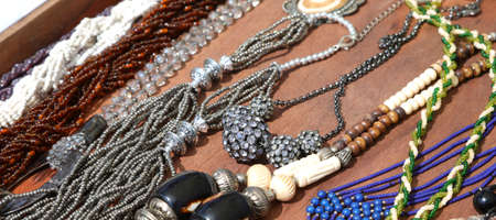 Colorful necklaces and bracelet mix, large group of beads and stone necklace, jewelry background