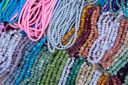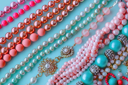 Colorful Beaded Jewelry on Blue Background - Trendy Fashion Accessories and Vintage Bead Necklaces
